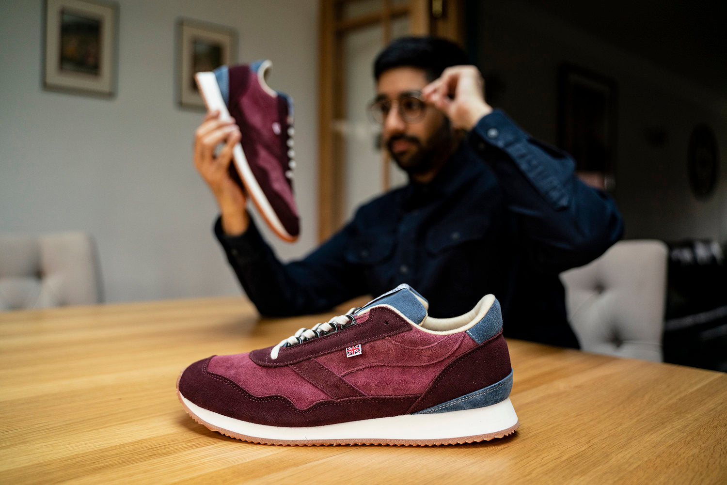 He took our iconic Tornado Silhouette developed in 1983 and transformed this into his suede burgundy interpretation.